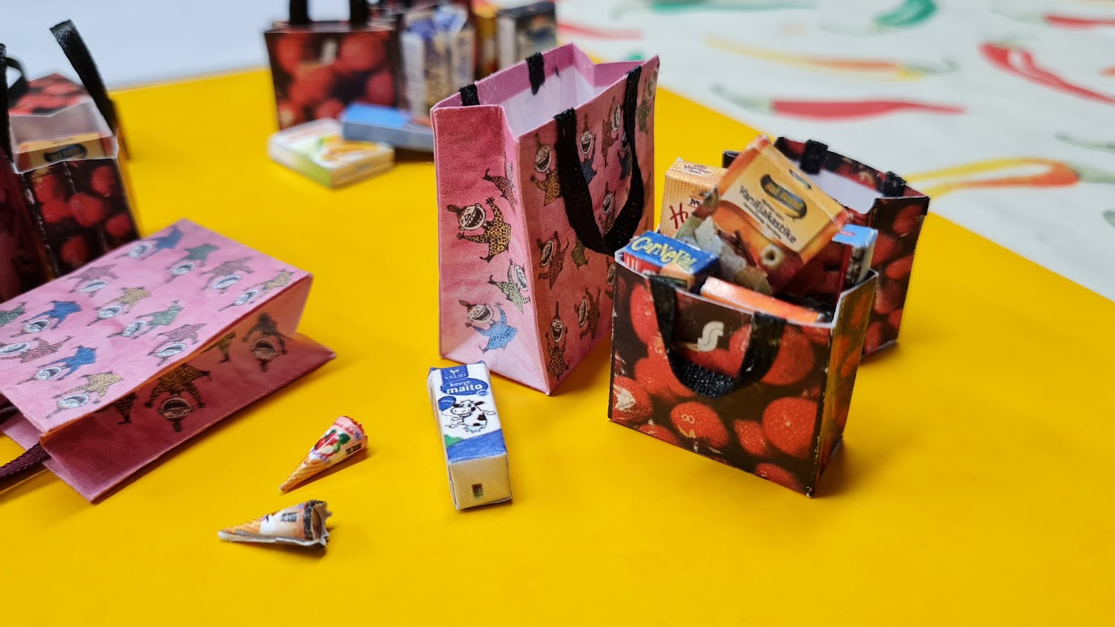 Nyt oli näppärät sormet tarpeen, sillä kerhoiltana askartelimme nukkekotikokoisia ruokapakkauksia ja kasseja. Alun sormijäykkyys oli pian selätetty ja saimme taiteltua kaikille ostoskassilliset ruokaa. Kivaa näpertelyä tämä!